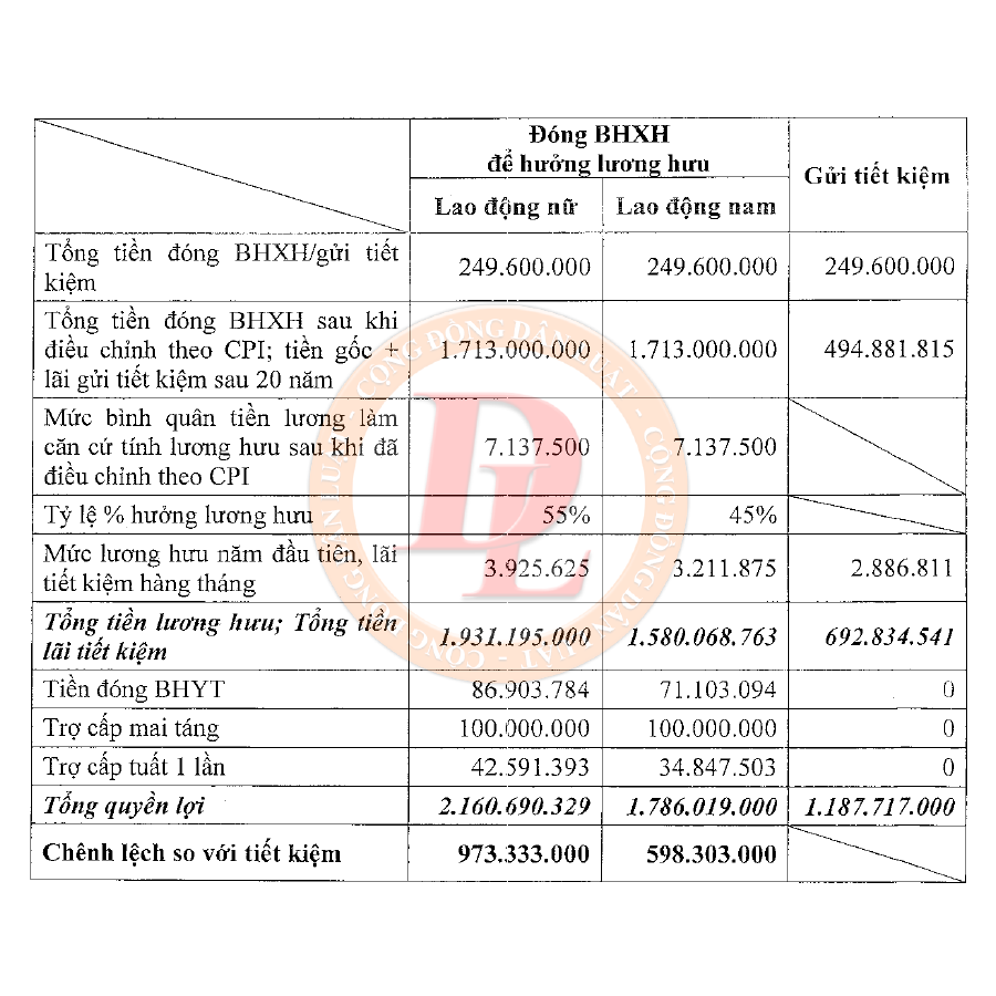 Như vậy, cùng với số tiền gửi tiết kiệm là 249.600.000 đồng, nhưng đầu tư để tham gia BHXH tự nguyện thì được hưởng an sinh xã hội trọn đời với tổng số tiền được hưởng là 2.160.690.000 đồng (đối với nam là 1.786.019.000 đồng) và nhiều hơn gửi tiết kiệm với số tiền rất lớn là 973.333.000 đồng (đối với nam là 598.303.000 đồng); trường hợp tham gia BHXH bắt buộc thì lợi ích là vô cùng lớn do số tiền người lao động phải bỏ ra đóng BHXH chỉ là 90.763.600 đồng, phần còn lại do đơn vị đóng. Ngoài ra, người lao động trong suốt thời gian hưởng lương hưu được khám, chữa bệnh do quỹ BHYT chi trả với số tiền không thể thống kê được.